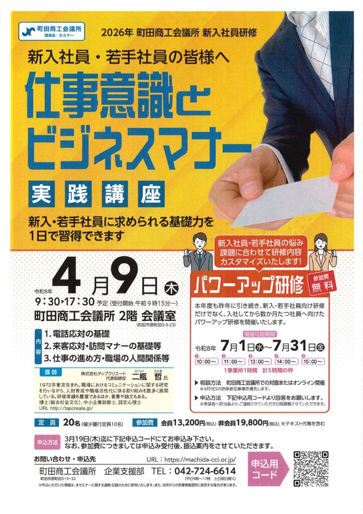 町田商工会議所では、新入社員や若手社員の方を対象とした、「仕事意識とビジネスマナー実践講座」を開催いたします。社会人基礎力を1日で学べる内容となっております。是非、受講をご検討ください。